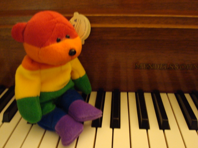 This is a photo of me at my piano. I am a piano teacher, a composer, and a musician by profession. I play the piano for a small band at a gay Christian church. Click on the photo to see photos of me and my rainbow friends.